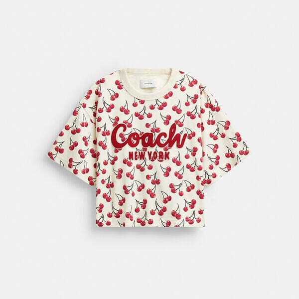 Description: Detailed with our cursive Coach script and cheerful cherry motif, this cropped T-shirt is crafted of organic cotton made without the use of harmful chemical fertilizers and pesticides. The boxy silhouette features a comfortable, easy-to-wear dropped shoulder.