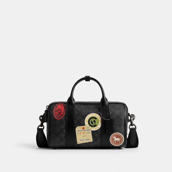 Description: A bag as distinct as its namesake city, the Gotham is a sleek no-fuss carryall. With inside multifunction pockets for easy organization, this compact Duffle 24 features an open interior with room for everyday essentials. Crafted of refined leather and our Signature canvas detailed with playful patches inspired by vintage luggage travel stickers, it's secured by a zip closure and finished with a detachable strap for shoulder or crossbody wear.