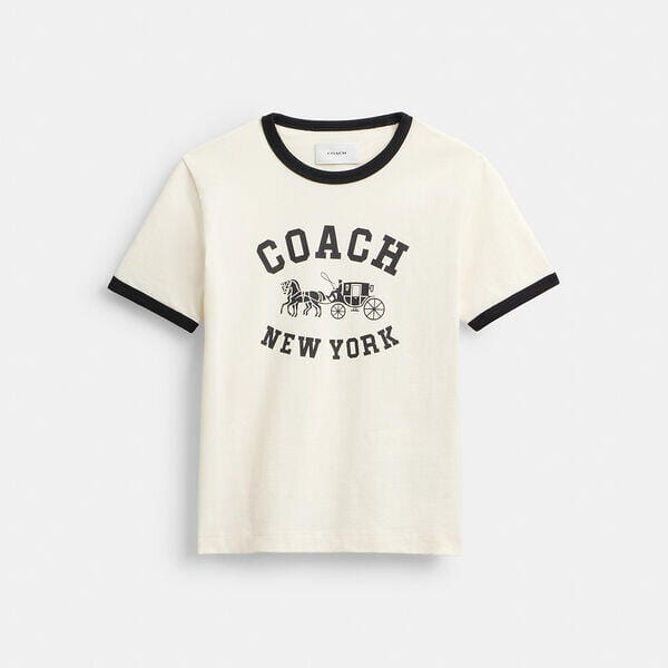 Description: Featuring our Coach graphic and iconic Horse and Carriage motif front and center, this classic-fit ringer T-shirt is finished with contrast binding trim. Crafted of organic cotton made without the use of harmful chemical fertilizers and pesticides, it's inspired by our commitment to rethinking and reducing our impact on the planet.