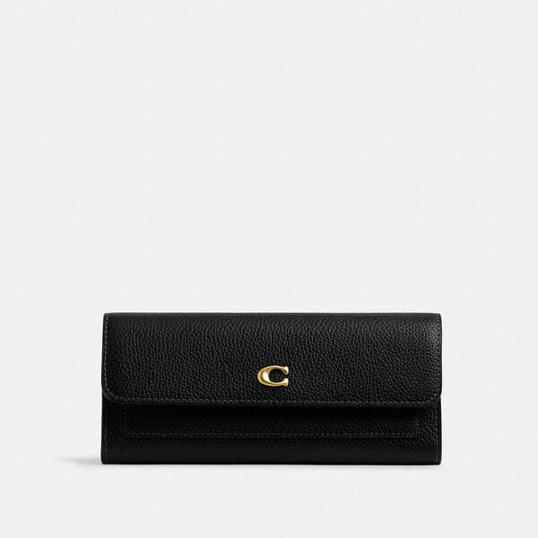 Description: Crafted of refined leather this comprehensive slim wallet keeps cards, ID, coins, bills and receipts neatly organized in a secure flap design. It's finished with an outside slip pocket for easy access to essentials.