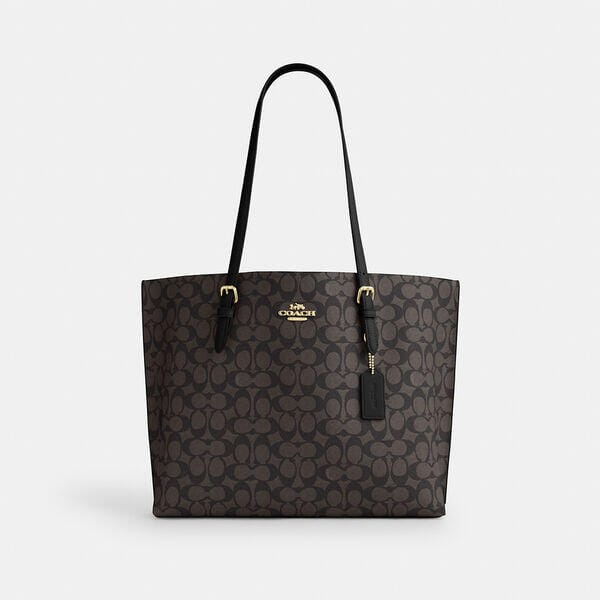 Description: Signature coated canvas. Trim partially made with recycled leather fiber layer. Inside multifunction pocket. Zip-top closure, fabric lining. Handles with 26cm drop. Side open compartments. 34cm (L) x 28cm (H) x 13cm (W).