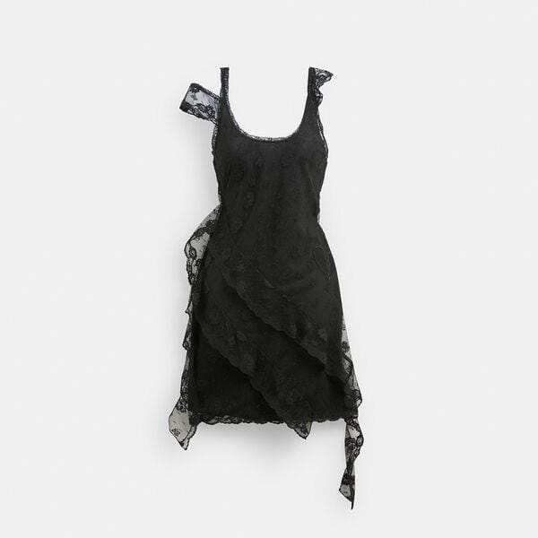 Description: Cascading ruffles, embroidered details and a heart motif add airy romance to this lace mini dress. Featuring a removable black slip, it's finished with a sporty scoop neckline.