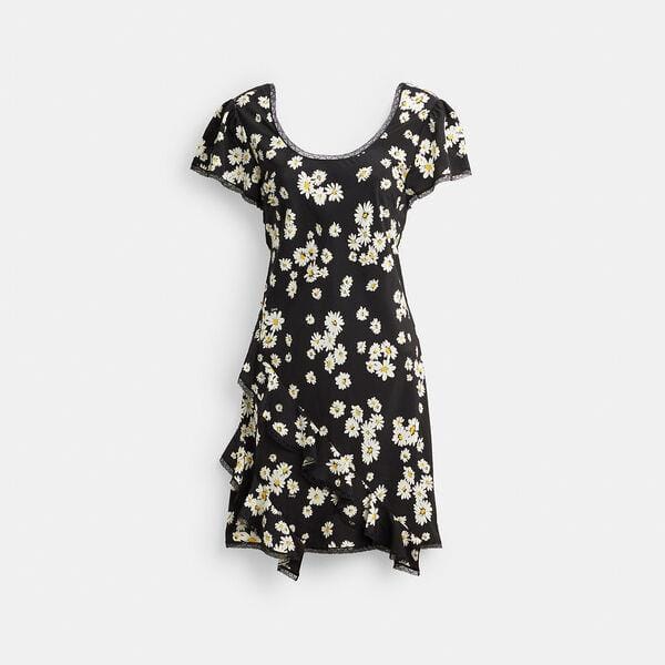 Description: Cascading ruffles, lace trim and a dramatic daisy motif add romance to this silk mini dress. Featuring a removable slip, the short silhouette is finished with a sporty scoop neckline and flutter cap sleeves.