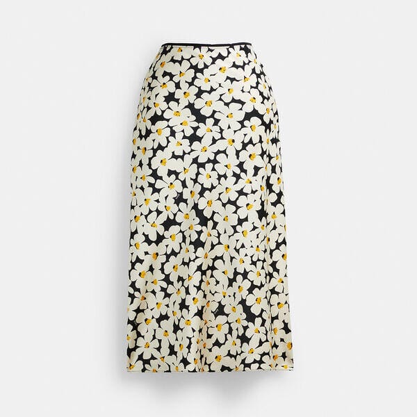 Description: Slip into easy, elegant style with this '90s-inspired bias-cut satin midi skirt featuring a dramatic daisy motif. Finished with a hidden zipper closure, the versatile design is detailed with our embroidered cursive Coach script at the waistband for a subtle heritage touch.