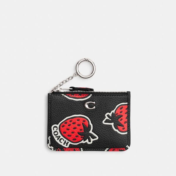 Description: Crafted of polished pebble leather featuring a playful strawberry motif and our Signature hardware, the Mini Skinny keeps keys, cards and other small essentials secure.