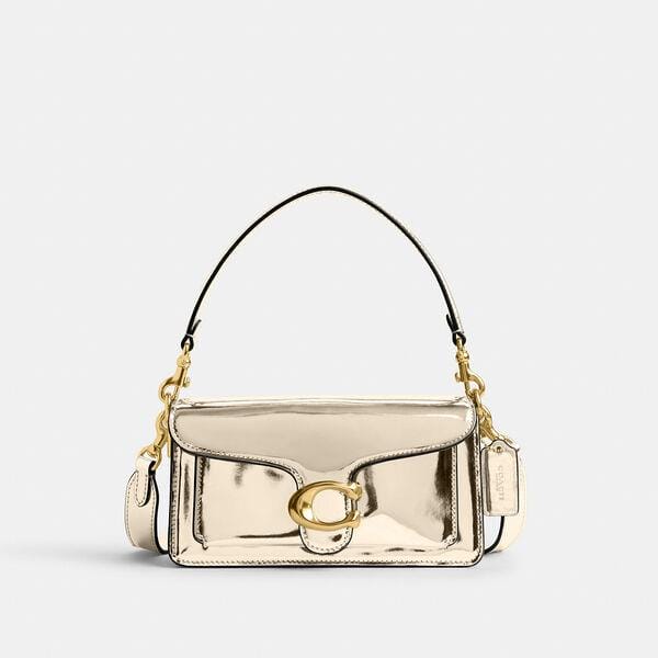 Description: A modern take on an archival 1970s Coach design, our structured Tabby shoulder bag is crafted of lustrous mirror metallic leather. Smaller than the 26, the petite 20 features two detachable straps to carry by hand, style as a short shoulder bag or wear crossbody. It's finished with our Signature hardware for an iconic touch.