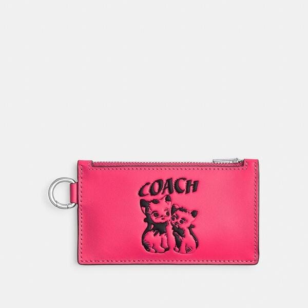 Description: Presenting the Lil Nas X Drop, an edit designed by Coach and curated by Coach Ambassador Lil Nas X, celebrating his unique and expressive approach to style. Crafted of luxe refined leather detailed with a playful graphic inspired by '90s underground rave posters, this case unzips to reveal an expandable pocket. A slim design that slips easily into pockets, it holds five cards and other small essentials. Clip it to a bag or secure to a set of keys with the attached D-ring.