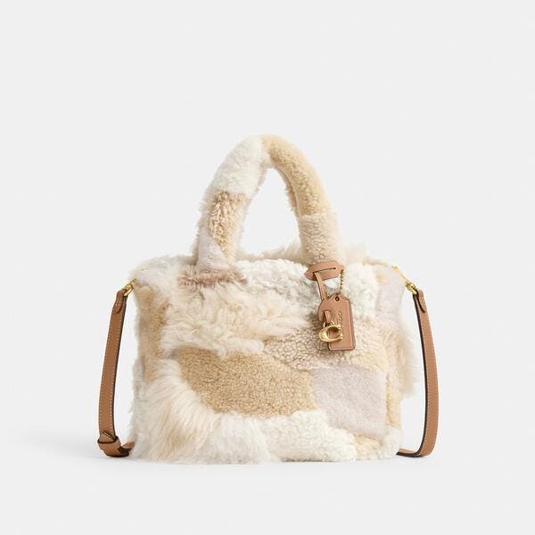 Description: Shearling and nappa Leather. Inside snap pocket. Zip-top closure. Fabric lining. Handles with 12cm drop. Detachable strap with 54cm drop for shoulder or crossbody wear. 22cm (L) x 20cm (H) x 11cm (W).