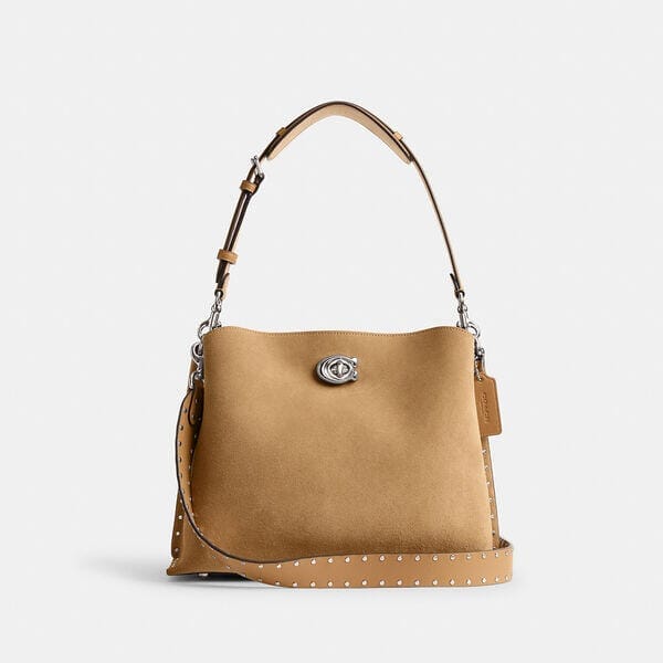 Description: Not too big, not too small, Willow is the perfect go-anywhere shoulder bag with space for all of your day-to-day essentials. Crafted of velvety suede and refined leather, it has an organized interior with one zip compartment, two open compartments and a snap pocket for small necessities. Embellished with striking polished rivets, the roomy trapezoid shape secures with our Signature turnlock closure and can be carried by hand, on the shoulder or crossbody.