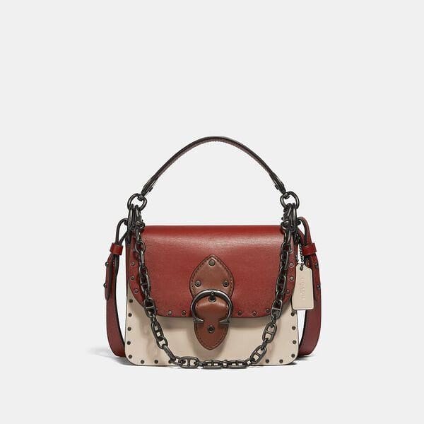 Description: Made for going places and doing things, our Beat bag is inspired by the heartbeat of New York City. Crafted of our colorblock soft glovetanned leather outlined with rivets, the compact 18 features three organized compartments and a secure snap closure accented with our Coach buckle. Add the interchangeable chain strap to instantly change the look of the bag or the crossbody strap for convenient hands-free wear.