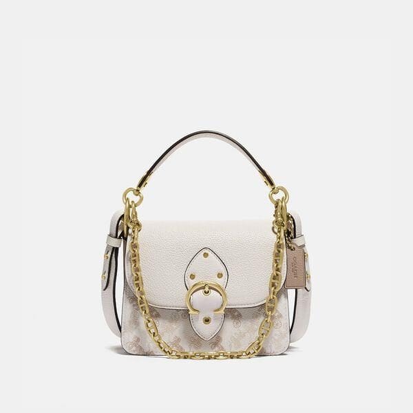 Description: Made for going places and doing things, our Beat bag is inspired by the heartbeat of New York City. Crafted of polished pebble leather and sturdy coated canvas featuring our iconic Horse and Carriage motif, the compact 18 has three organized compartments and a secure snap closure accented with our Coach buckle. Endlessly versatile, add the interchangeable chain strap to instantly change the look of the bag or the crossbody strap for convenient hands-free wear.