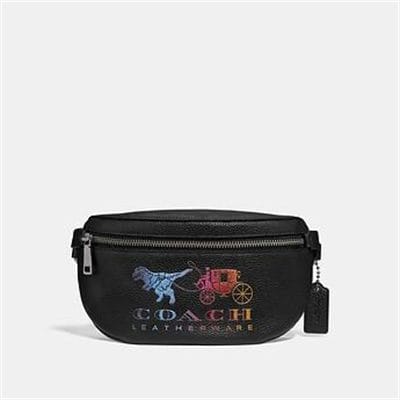 Description: An update of a street-ready design, the ultra-convenient Belt Bag keeps hands free and essentials organized. It’s crafted in polished pebble leather detailed with a playful twist on our Horse and Carriage icon featuring mascot Rexy in a cool glittery rainbow ombré. Wear it cinched at the waist, over the shoulder or draped crossbody for a versatile look.Features:Polished pebble leatherTwo credit card slotsInside open pocketZip closure, fabric liningAdjustable strap for wear at waist22cm (L) x 12cm (H) x 4cm (W)