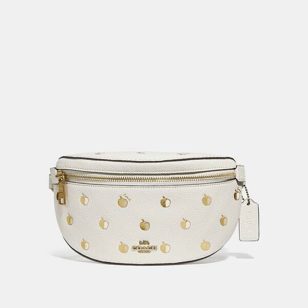 Description: An update of a street-ready design, the ultra-convenient Bethany Belt Bag keeps hands free and essentials organized. Crafted of polished pebble leather featuring a shimmery metallic foil apple print, wear it cinched at the waist, over the shoulder or draped crossbody for a versatile look.
