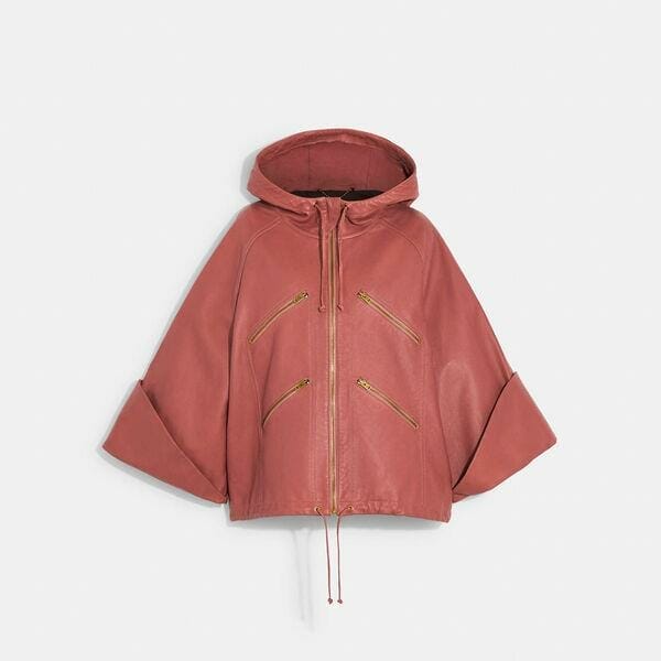 Description: Give your outerwear a luxe touch with this streamlined topper crafted of supple leather that gets even softer with wear. Inspired by our archives and the innovative designs created by Coach’s first head designer Bonnie Cashin, the hooded design is detailed with multiple zip pockets for stashing essentials and a bottom drawstring to adjust the fit and shape.