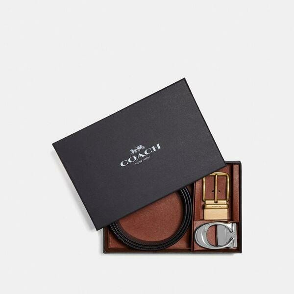 Description: Our bestselling Harness Belt meets our sculpted Signature in this distinguished set which offers two looks in one design with interchangeable buckles. Crafted of durable pebble leather, the fit is completely customizable-just cut the end with scissors. It comes packaged and ready to gift in a signature Coach box.