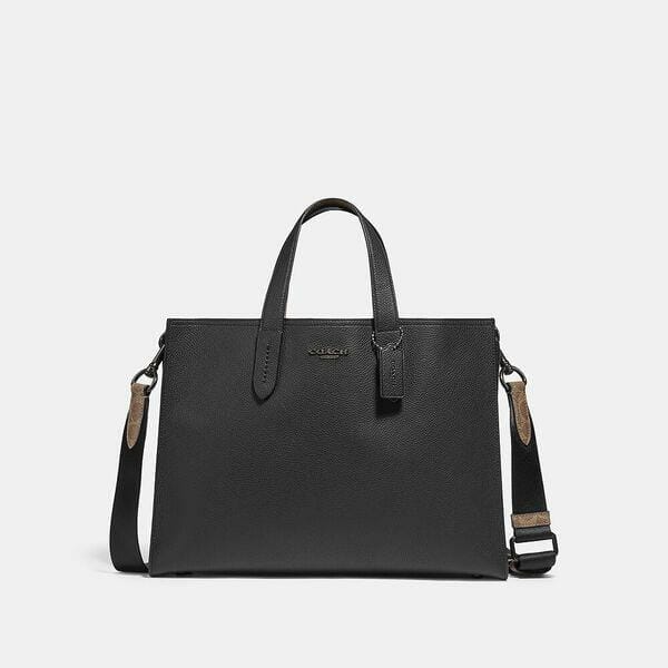 Description: A modern classic, the Charlie Brief is a refined, confident design with clean lines and sleek functionality. It features a secure, center zip compartment and two open sections with room to hold a 13″ laptop, notebooks, documents as well as multifunction pockets for a phone and small essentials. The spacious, organized carryall is crafted of polished pebble leather and our Signature canvas.