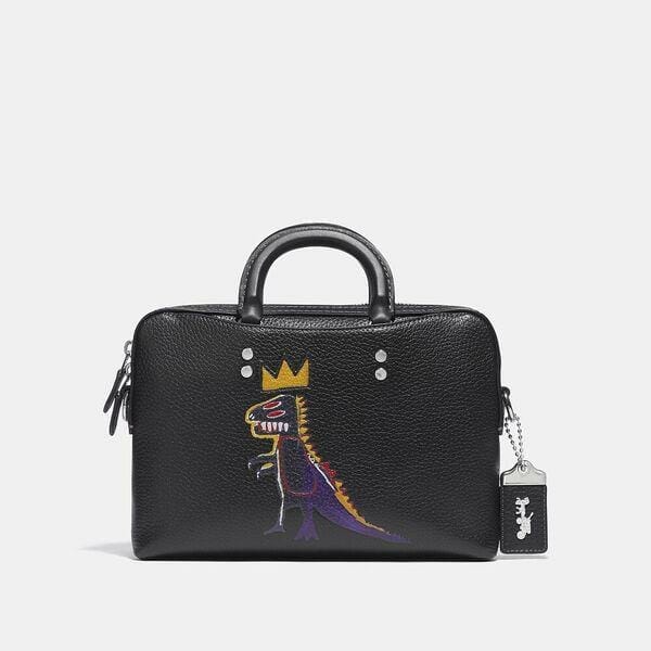 Description: Coach celebrates and honors renowned New York City artist Jean-Michel Basquiat with a special collection featuring elements from his revolutionary works of art. Inspired by free spirits, rebels and dreamers, our aptly named Rogue is a go-anywhere bag crafted in a mix of natural pebble leather and buttery soft glovetanned leather. This streamlined Slim Brief 25 has a secure center zip compartment with two outside slip pockets for easy access to essentials and is finished with a bold motif from the iconic artist’s rebellious paintings. About the artist: Jean-Michel Basquiat is widely considered one of the most important artists of the 20th century. Known for his raw Neo-Expressionist pieces, Basquiat gained international acclaim in the late ’70s and ’80s for creating works of art that were both political and deeply personal. Featuring colorful abstract imagery and phrases inspired by African, Aztec, and Greek cultures, African American history and topics related to social justice, his pieces reflect the political and social turmoil of his generation that continues to this day.