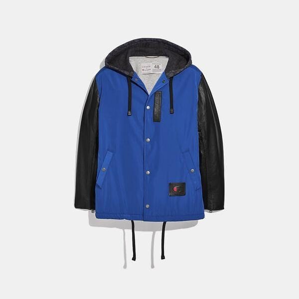 Description: A limited-edition collection celebrating the legacies of two American icons, this collaboration combines Coach craftsmanship with the heritage of Champion athleticwear. Take a cue from the classic. This snap-front Coaches Jacket has luxe leather details and a stow-away hood printed with a hybrid of our Signature and the Champion “C.” Featuring a lightweight-fill, the water-resistant style is finished with snap pockets.