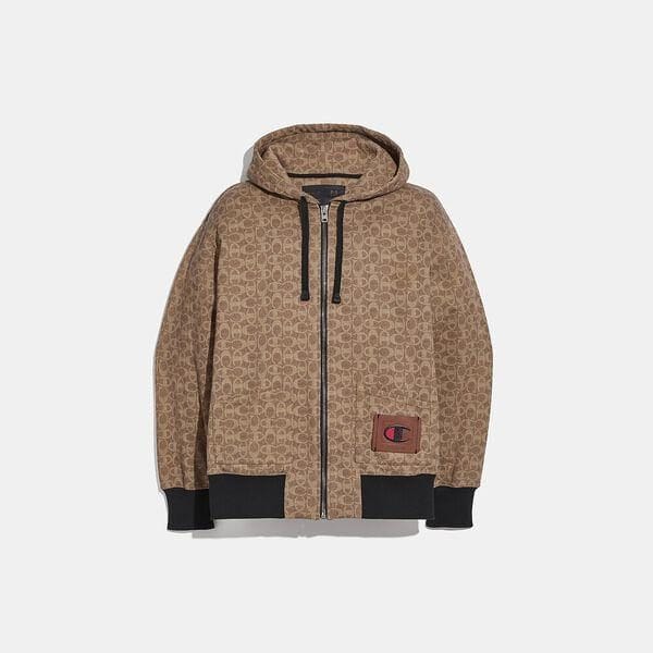 Description: A limited-edition collection celebrating the legacies of two American icons, this collaboration combines Coach craftsmanship with the heritage of Champion athleticwear. Rethink a sporty classic with this zip-front fleece hoodie featuring a hybrid motif of our Signature and the Champion “C.” Crafted of a soft cotton-blend, it’s finished with slip pockets, cozy ribbed trim and the Champion leather logo patch.