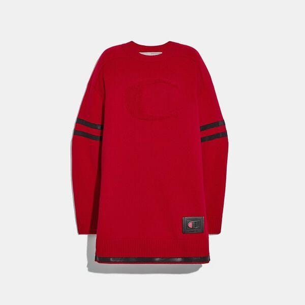 Description: A limited-edition collection celebrating the legacies of two American icons, this collaboration combines Coach craftsmanship with the heritage of Champion athleticwear. Get your game on. This sporty-luxe wool-and-cashmere sweater dress features a dimensional Champion “C” front and center and contrast varsity stripes. The pullover style is finished with soft ribbed trim and the Champion leather logo patch.