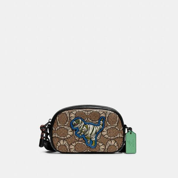 Description: In his latest collaboration with Coach, actor and producer Michael B. Jordan enlisted L.A.-based artist Blue the Great to give our house icons his trademark mummy treatment. Featuring a mummy-wrapped Rexy (our beloved mascot) set against our mummified Signature canvas, this compact style is inspired by vintage camera bags. The lightweight bag is a versatile way to go hands-free with room for a phone, cards, cash, keys and other essentials.