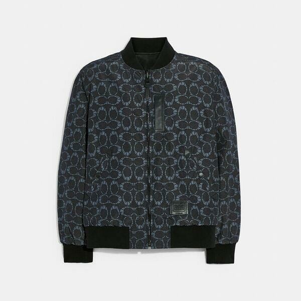 Description: In his latest collaboration with Coach, actor and producer Michael B. Jordan enlisted L.A.-based artist Blue the Great to give our house icons his trademark mummy treatment. Inspired by an authentic MA-1 flight jacket, this versatile sporty style features a mummified take on our iconic Signature. Detailed with soft knit ribbed trim, it’s crafted of buttery soft smooth leather on one side and reverses to lightweight nylon on the other.