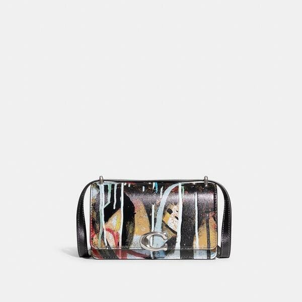 Description: Coach collaborates with celebrated graffiti artists Mikhail Sokovikov and Jason Aaron Wall of Mint + Serf in this special collection that captures the raw, dynamic energy of New York City. Detailed with our C pushpin closure, this sophisticated flap front Bandit crossbody crafted of buttery soft glovetanned leather finished with a bold motif from the rebel artists’ compositions. The dual compartment design features a secure interior snap pocket, a convenient exterior pocket and a shoulder strap that adjusts for crossbody wear. About the Creatives: Artists Mikhail Sokovikov (aka, Mint) and Jason Aaron Wall (aka, Serf) met as teenagers in Bensonhurst, Brooklyn, and started using the streets of New York as their canvas. Believing that the beauty of graffiti lies in its illicit aggressiveness and nonconformity, they produce impromptu dynamic compositions that channel the inherent tension and defiant grit of the artform-and the city they call home. The capsule collection features paintings from Mint + Serf’s seminal series, Support, Therapy and Instability (2012-2016) created at The Broadway Chapter in collaboration with Christopher Johnson, Pablo Power, and the PPP!
