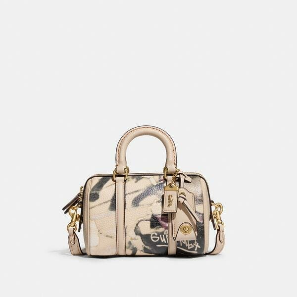 Description: Coach collaborates with celebrated graffiti artists Mikhail Sokovikov and Jason Aaron Wall of Mint + Serf in this special collection that captures the raw, dynamic energy of New York City. An unforgettable design, our Ruby satchel has an iconic rounded shape and an elongated zipper that opens wide for easy access to the interior. Crafted of buttery soft glovetanned leather and natural pebble leather featuring a bold motif from the rebel artists’ compositions with an embroidered accent, the compact 18 has multifunction pockets for great organization. Carry by the drop-down luggage handles or attach the comfortable wide crossbody strap for hands-free styling. About the Creatives: Artists Mikhail Sokovikov (aka, Mint) and Jason Aaron Wall (aka, Serf) met as teenagers in Bensonhurst, Brooklyn, and started using the streets of New York as their canvas. Believing that the beauty of graffiti lies in its illicit aggressiveness and nonconformity, they produce impromptu dynamic compositions that channel the inherent tension and defiant grit of the artform-and the city they call home. The capsule collection features paintings from Mint + Serf’s seminal series, Support, Therapy and Instability (2012-2016) created at The Broadway Chapter in collaboration with Christopher Johnson, Pablo Power, and the PPP!