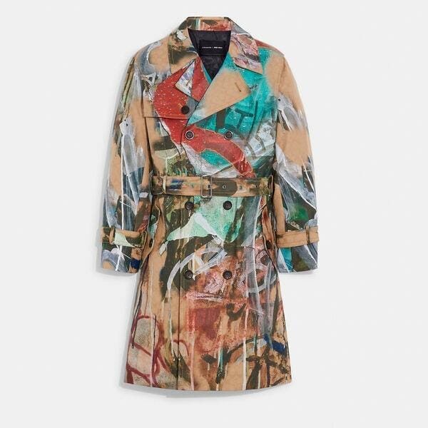 Description: Coach collaborates with celebrated graffiti artists Mikhail Sokovikov and Jason Aaron Wall of Mint + Serf in this special collection that captures the raw, dynamic energy of New York City. Crafted in a sturdy cotton, this double-breasted trench coat features a bold motif from the rebel artists’ compositions mixed with our Signature. The classic style is finished with a storm flap, an adjustable belt at the waist, belted cuffs and a back vent for ease of movement.