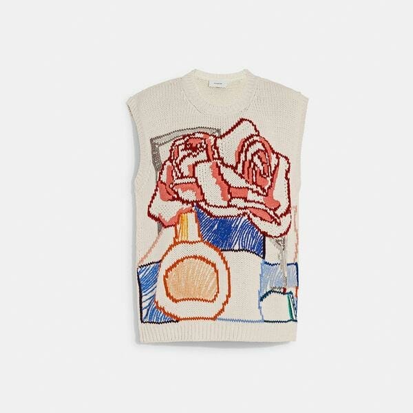 Description: Coach pays homage to legendary New York City artist Tom Wesselmann with this playful, Pop Art-inspired collection. Crafted of breathable cotton, this relaxed sweater vest is detailed with a colorful sketched still life and finished with ribbed trim. About the artist: A master of vivid color and larger-than-life scale, Tom Wesselmann is widely considered one of the most dynamic American artists of the twentieth century. Rejecting abstract expressionism in favor of striking representations of the female form, still life and landscapes, Wesselmann has a penchant for finding the extraordinary in the everyday.