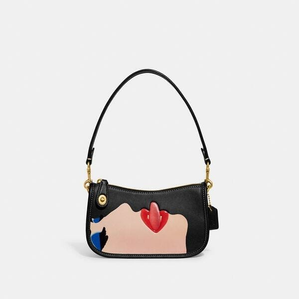 Description: Coach pays homage to legendary New York City artist Tom Wesselmann with this playful, Pop Art-inspired collection. Based on a 1980s Coach design reimagined for today, the streamlined Swinger 20 Bag is crafted of our buttery soft glovetanned leather detailed with a vibrant portrait. Finished with our iconic turnlock closure, the petite bag sits just beneath the underarm with the short strap or it can be carried as a clutch. About the artist: A master of vivid color and larger-than-life scale, Tom Wesselmann is widely considered one of the most dynamic American artists of the twentieth century. Rejecting abstract expressionism in favor of striking representations of the female form, still life and landscapes, Wesselmann has a penchant for finding the extraordinary in the everyday.