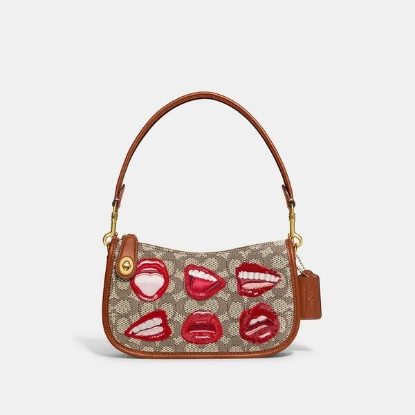 Description: Coach pays homage to legendary New York City artist Tom Wesselmann with this playful, Pop Art-inspired collection. This Swinger is crafted of environmentally conscious Signature Textile Jacquard-a lovingly crafted material made from a blend of organic cotton and recycled plastic bottles. It’s all part of our commitment to rethinking and reducing our impact on the planet by repurposing waste materials. Finished with our iconic turnlock closure and detailed with a bold, expressive lip motif, the zip-top streamlined style is based on a 1980s Coach design and sits just beneath the underarm for hands-free convenience. About the artist: A master of vivid color and larger-than-life scale, Tom Wesselmann is widely considered one of the most dynamic American artists of the twentieth century. Rejecting abstract expressionism in favor of striking representations of the female form, still life and landscapes, Wesselmann has a penchant for finding the extraordinary in the everyday.