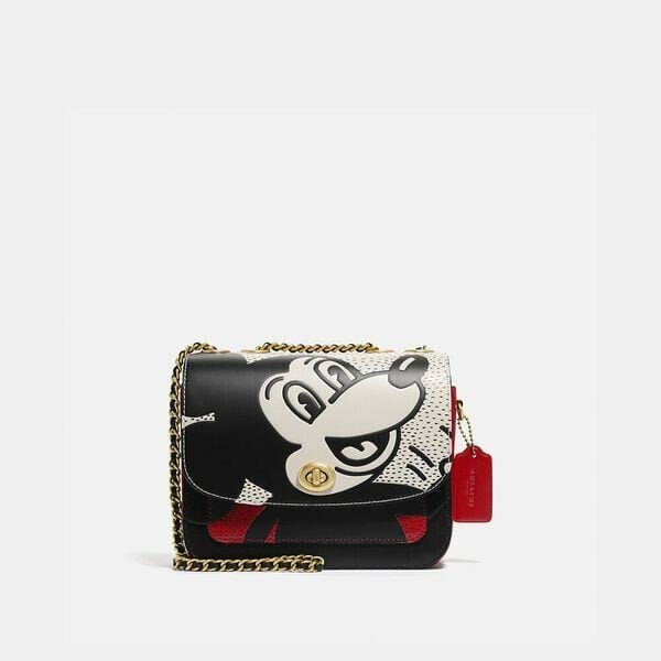 Description: In a special collection, Coach collaborates with Disney and the Keith Haring Studio to celebrate the iconic artist’s playfully subversive illustrations of the one and only Mickey Mouse. The Madison is a timeless style with modern proportions-designed for work, weekends and everywhere life takes you. Featuring original artwork by the American artist on refined leather, it’s finished with an exterior pocket for easy access to essentials and our turnlock closure. Convert the leather chain strap from long to two short handles. About the artist: Artist Keith Haring (1958-1990) was inspired by the art of Walt Disney from an early age, learning to draw Disney’s Mickey Mouse from a Disney “how-to-draw” book he found at his grandmother’s house. Well into his teenage years Haring wanted to be a cartoonist, thinking he could work for Disney, though he ultimately went on to study fine art. Eventually, Haring’s passion for both cartooning and the visual arts combined in what became his unique and widely recognized style. Mickey Mouse is a recurring figure in Haring’s art, when asked why, he said Mickey is “ultimately a symbol of America more than anything else.”