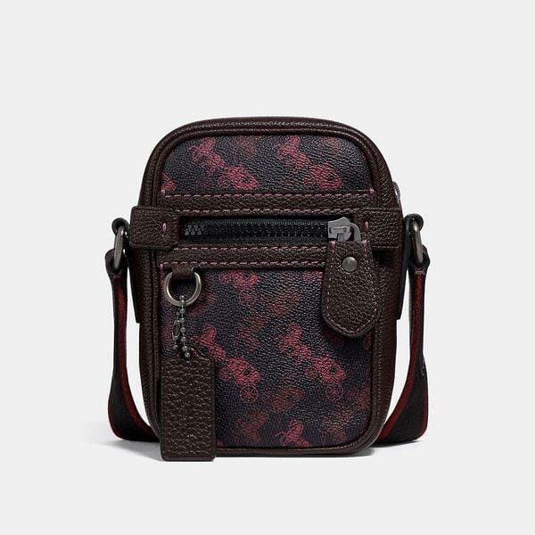 Description: The Dylan is inspired by flight bags from the 1970s. Crafted of polished pebble leather and sturdy coated canvas featuring our iconic Horse and Carriage motif, this compact, hands-free design features exterior zip and slip pockets for easy access to essentials.