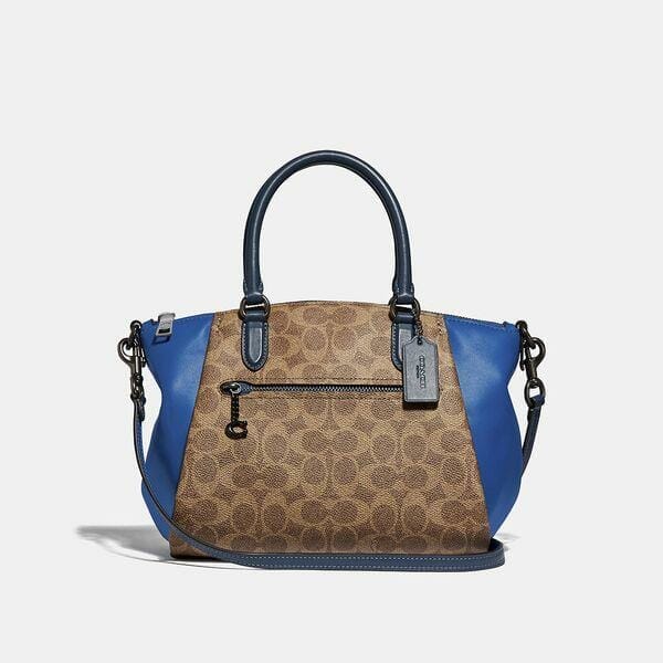 Description: Based on a best-selling Coach design, the Elise satchel is the perfect bag for everyday. With a convenient exterior zip pocket accented with a Signature charm and interior pockets to keep everything organized, it’s crafted of refined leather and our Signature canvas. Carry by the top handles or attach the adjustable strap and wear it crossbody.