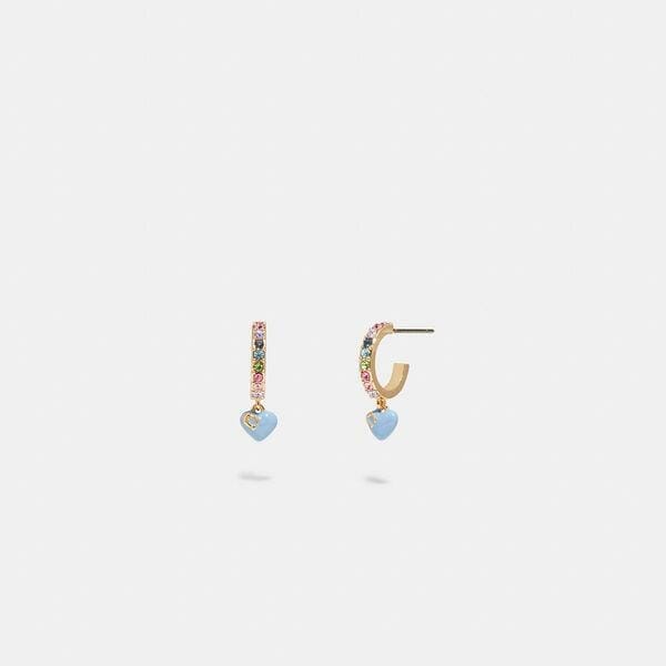 Description: Spread some love. Featuring vibrant pavé stones, these hoop earrings hug the earlobe and are finished with a dangling bright enamel heart charm detailed with our Signature.