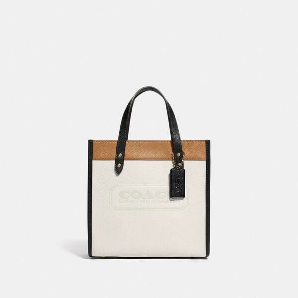 Description: From busy weekdays to fun-filled weekends, our Field Tote 22 has space to hold everything you need with an inside zip pocket to hold small essentials. Finished with our Coach Badge, this versatile carryall is crafted of colorblock polished pebble leather. Attach the lightweight webbing strap to wear on the shoulder or crossbody.