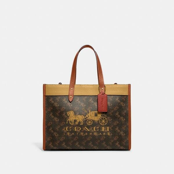 Description: From busy weekdays to fun-filled weekends, our Field Tote 30 has space to hold everything you need and an interior zip pocket to hold small essentials. Featuring our Horse And Carriage Print Badge, this versatile carryall is crafted of Printed coated canvas and polished pebble leather. Attach the lightweight webbing strap to wear on the shoulder or crossbody.