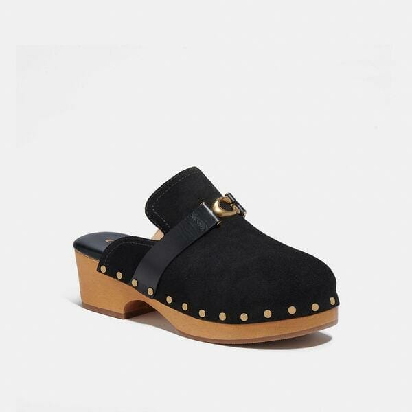 Description: A classic retro-cool style, our Finlay clog features polished rivets and our Signature hardware for a heritage touch. Crafted of soft suede, it’s set on a sturdy wooden platform with a rubber sole for added traction.