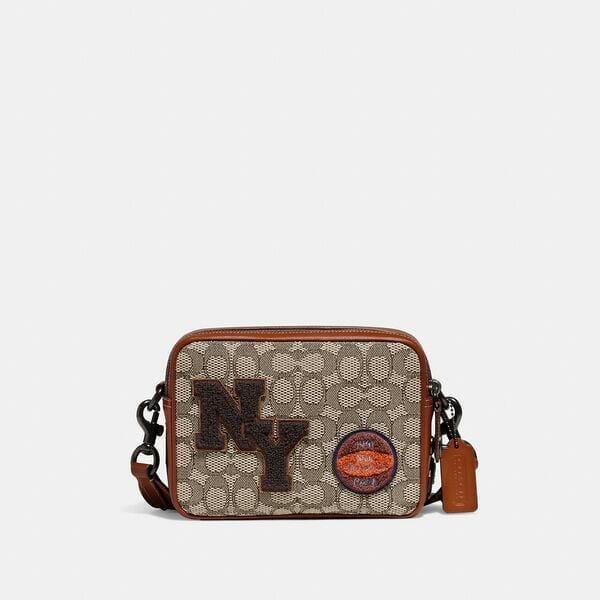 Description: Our Flight Bag is a modern crossbody inspired by the compact functionality of retro airline attendant bags. Crafted of glovetanned leather and our Signature Textile Jacquard, a blend of organic cotton and recycled polyester made from recycled plastic bottles, this compact 19 is part of our commitment to rethinking and reducing our impact on the planet by repurposing waste materials. Finished with our playfully sporty Varsity patches, it has a secure zip top, an inside multifunction pocket for small accessories and outside pocket for easy access to essentials. Wear crossbody with the detachable strap or tuck it inside of a larger bag.