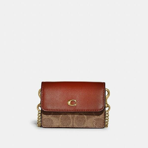 Description: Signature coated canvas and refined calf leather. One credit card slot. Snap closure, fabric lining. Outside slip pocket. Detachable chain strap with 53cm drop for shoulder or crossbody wear. 10cm (L) x 7.5cm (H) x 2.5cm (W).