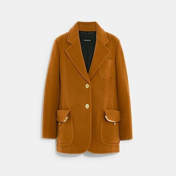 Description: Borrow from the boys, this tailored wool-blend jacket is a classic silhouette influenced by a traditional men’s blazer. It’s detailed with patch pockets secured by our kisslock closures- an archival element first introduced by Coach’s first head designer Bonnie Cashin in the 1960s and still a Coach favorite today.