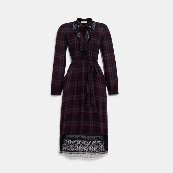 Description: Combine rich plaid and airy lace with this versatile wool-blend dress. The relaxed-fit style is finished with a removable neck tie and belt for multiple styling options.