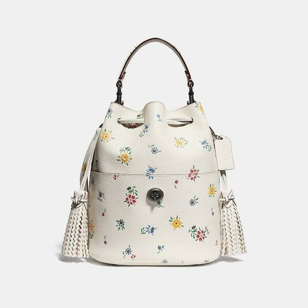 Description: Polished pebble leather. Inside snap pocket. Drawstring closure, leather lining. Detachable handle with 13.5cm drop. Outside turnlock pocket. Detachable strap with 54.5cm drop for shoulder or crossbody wear. Four protective feet at base. 21.5cm (L) x 25cm (H) x 12.5cm (W).