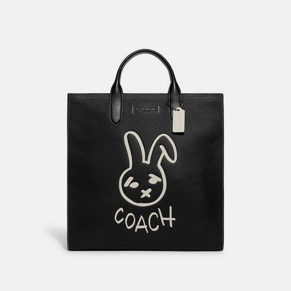 Description: Celebrate 2023 Year of the Rabbit with our special Lunar New Year collection. A bag as distinct as its namesake city, the Gotham is a sleek, streamlined style that means business. Secured by a zip closure, the textured pebble leather and smooth refined leather Tall Tote features a spacious interior with multifunction pockets for organizing essentials. Detailed with our graffiti-style rabbit graphic, carry the versatile bag by hand or crossbody with the lightweight detachable strap.