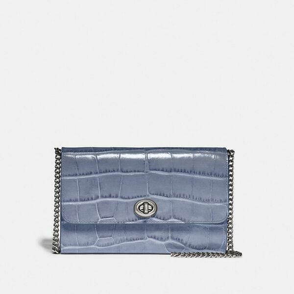 Description: Crocodile-embossed leather and refined calf leather. Two credit card slots. Inside open and zip pockets. Turnlock closure, fabric lining. Outside open pocket. Detachable chain strap with 56cm drop for shoulder or crossbody wear. 19.5cm (L) x 12.5cm (H) x 3cm (W).