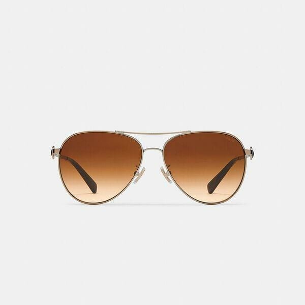 Description: A timeless look. These lightweight metal sunglasses are a modern take on the iconic pilot style. The temples are finished with archival Coach hardware inspired by Bonnie Cashin, Coach’s first head designer.