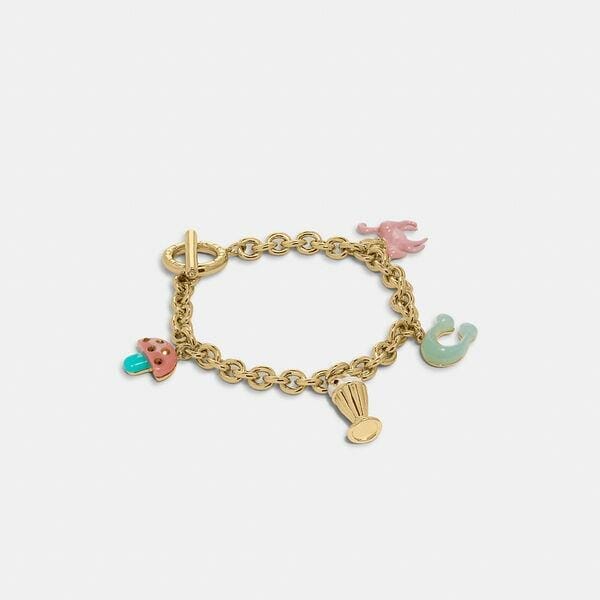 Description: A playful mushroom, delicious milkshake, magical unicorn and our Signature add a touch of fun to this charm bracelet. It’s finished with a toggle closure.