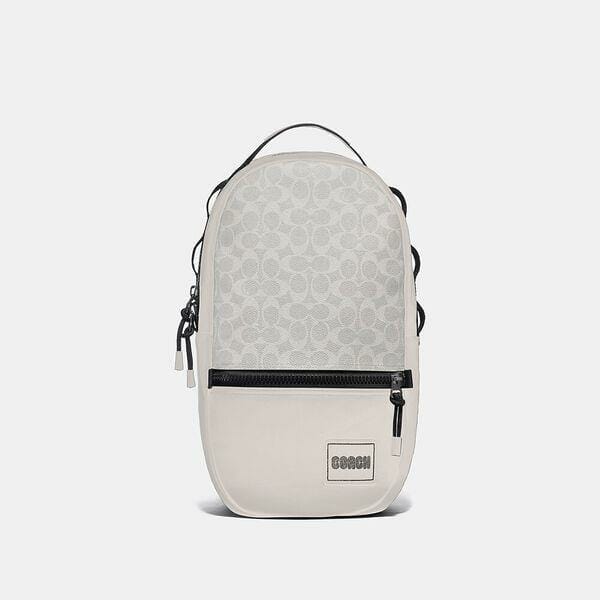 Description: Designed to keep pace with your busy day, our streamlined Pacer was made for life on the move. With a contoured shape perfect for comfortable all-day wear, this sporty backpack is crafted of our Signature canvas and smooth leather finished with our Coach retro patch. The organized interior has a secure tech sleeve with room for a 12″ laptop and multifunction pockets to hold a phone, notebooks, water bottle and other everyday essentials.