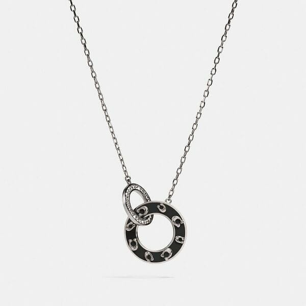 Description: This delicate necklace features a pair of interlocked rings, one sparkling with brilliant crystals, the other detailed with our scattered Signature hardware for a heritage touch. The adjustable clasp lets you wear it long or short.